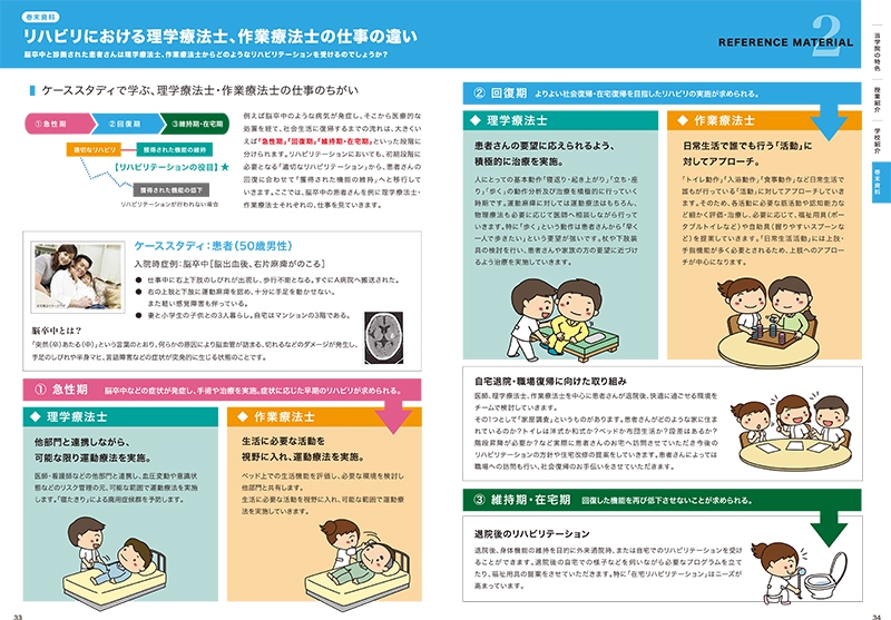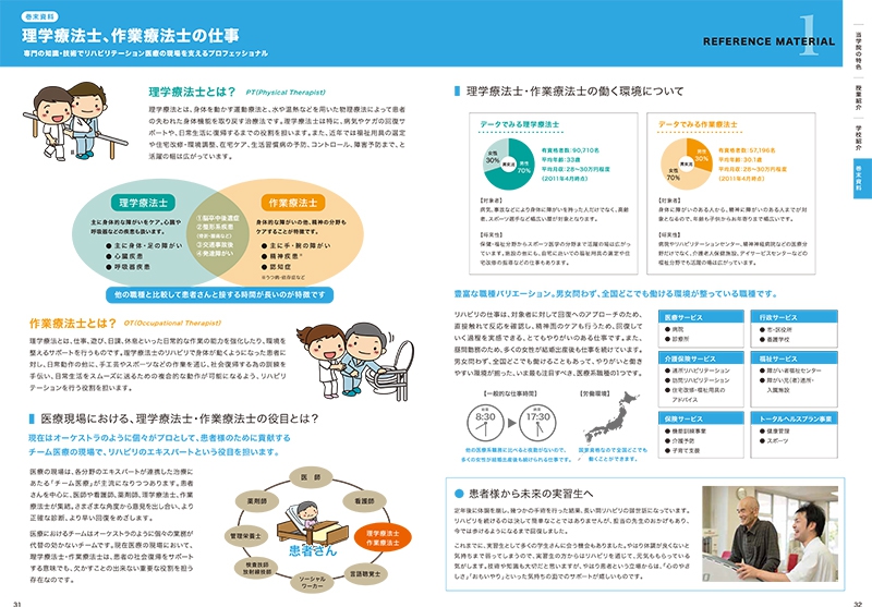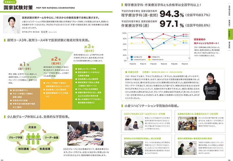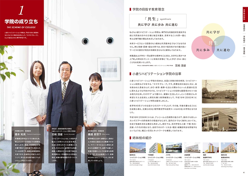 リハビリテーションに特化した、専門学校のパンフレット作成を担当させていただいた際には、まずパンフレットの目的を「新入生の獲得」「同業他社との差別化」と位置づけ、マーケティング戦略を立てるところから、はじめました。その後、生徒や先生方へのインタビュー、作業療法や理学療法に関する参考資料などを出来る限り読み、学校の魅力を文章化していきページ構成などを作りました。その後、アートディレクターとしてフォトグラファーに撮影指示を出し、最終的なデザインワークまでを、私が行いました。必要に応じてイラストレーターや、フォトグラファーなどのプロとチームを組んで仕事を行いますが、基本的に私が責任をもって、戦略構築→文章化→デザインまでの全てを行うことで、伝えるべきメッセージがブレることなく、しかも時間を効率よく使いながら、お仕事を完了させていただきました。