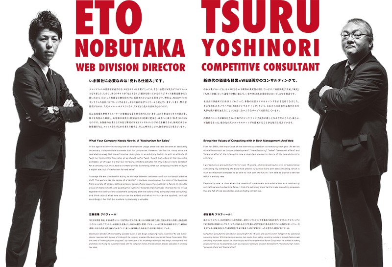 インターネットマーケティングを専門とする企業のパンフレットです。映画のようなスタイリッシュな雰囲気をフォトグラファーにディレクションしながら、会社をPRするのに必要な文章を作成。国際的な活躍も視野にいれた企業のため、パンフレットの文章はすべて、英語に翻訳し、バイリンガル表記をさせていただきました。