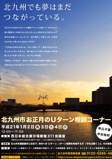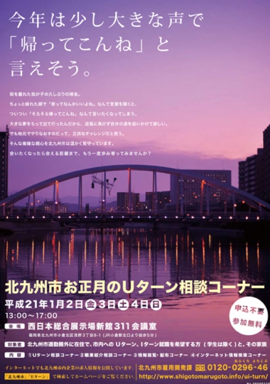 北九州市のUターン相談コーナーのポスターです。「北九州でも夢はまだつながっている。」「今年は少し大きな声で、帰ってこんね、と言えそう」という2つのコピーを用意しました。「北九州でも夢はまだつながっている。」は市外で貼られるポスターなので、市外に住む人に向けたメッセージを。逆に、市内で使われるポスターは、対象者がUターンする人の家族になることを見越して、親の目線でのメッセージにする、という使い分けを提案しました。
